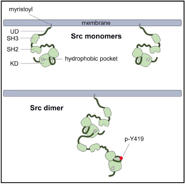 We are interested in understanding how, if at all, the functions of Src kinases are perturbed in human cancers. We believe that the mode of function of Src kinases is not well understood, and this has limited our ability to understand its mode of dysfunction in human cancers. We are studying how Src kinases select substrates, the temporal regulation of substrate selection, and the structural basis for substrate selection. In particular, since much of our understanding of the mode of regulation of Src comes from crystallographic studies, the role of the unstructured N-terminal unique domain of Src has been poorly understood. Recent evidence suggests that unstructured regions of proteins are critically involved in their regulation, and are particularly targeted by post-translational modifications. We have shown that although the Src unique domain mediates membrane binding, it also mediates Src dimerization, potentially creating a conformational landscape that can be regulated by post-translational modifications.