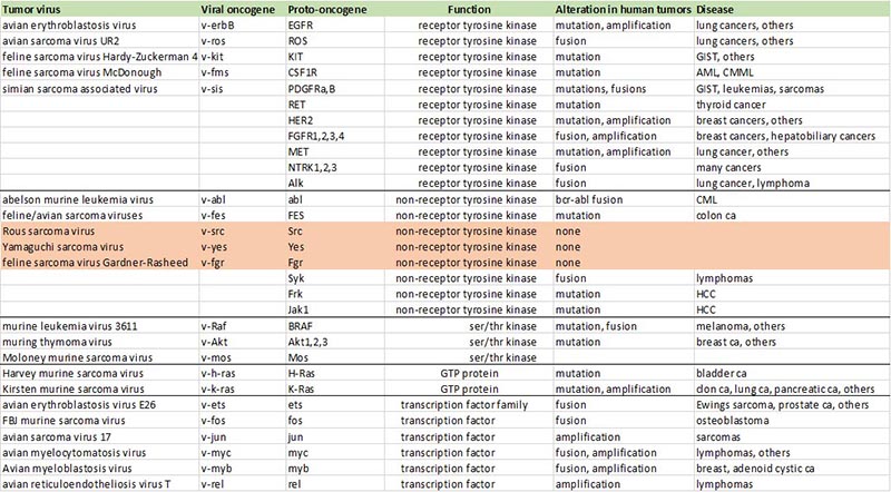 But the hypothesis remains unproven for c-src itself, or any of the Src family members, and despite decades of studies, there is little evidence that human cancers arise due to the activation of the c-src proto-oncogene. The mutational activation of Src kinases is not seen in human tumors, and although an increase in expression and associated activities of Src and Yes are seen in many epithelial cancers, Src kinases are not transforming through overexpression alone, and the attribution of a tumor-driving function to these kinases remains a weakly supported notion at this time. Several classes of Src-selective tyrosine kinase inhibitors have now been tested in clinical studies showing little evidence of clinical efficacy. Although the tumorigenic role of the retroviral v-src in generating chicken sarcomas is clear, the role of cellular Src kinases in human cancers remains largely unknown. As such, the 1970s idea that the proto-oncogene c-src is activated to an oncogene in human cancers is now conceptually deadlocked.